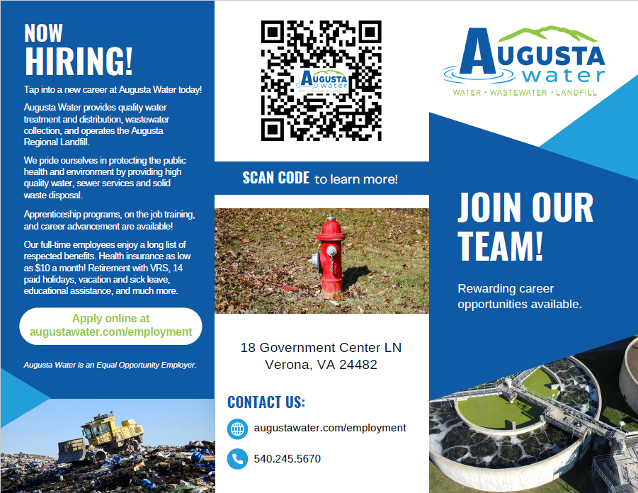 Standout Arts, LLC partnered with Augusta Water (formerly Augusta County Service Authority) on their successful rebrand to Augusta Water. In addition to the design and finalization of their new logo, Standout Arts assisted Augusta Water on a variety of graphic design projects for community outreach including the layout and design of their Strategic Plan and graphics for employment ads.